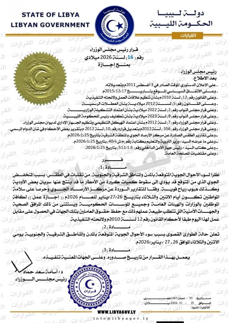 أصدر رئيس الحكومة الليبية أسامة حماد الأحد القرار رقم (16) لسنة 2026م، بشأن منح يومي الاثنين والثلاثاء المقبلين إجازة رسمية تحسباً لسوء الأحوال الجوية المتوقعة