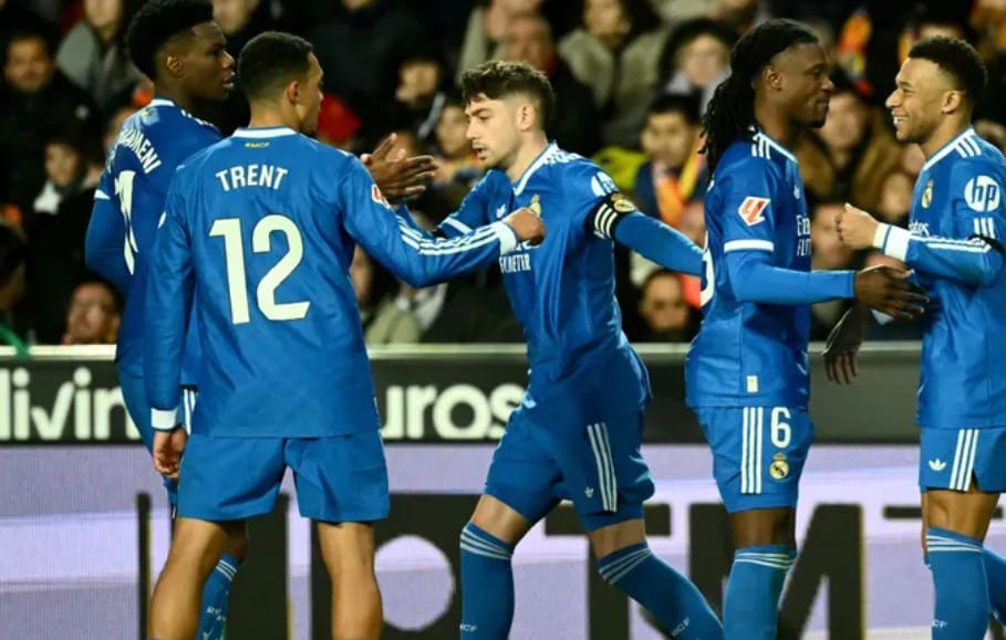 حقّق ريال مدريد فوزاً ثميناً على مضيفه فالنسيا بهدفين نظيفين في المرحلة الثالثة والعشرين من منافسات الدوري الإسباني لكرة القدم وافتتح ألفارو كاريراس التسجيل لفريق العاصمة الإسبانية في الدقيقة (65) وضاعف النجم الفرنسي كيليان مبابي النتيجة للميرينغي في الدقيقة (90+1) وأنعشت هذه النتيجة آمال الفريق الملكي الساعي إلى استعادة لقب الليغا من غريمه التقليدي برشلونة وبات في جعبة ريال مدريد 57 نقطة في المركز الثاني بفارق نقطة واحدة خلف برشلونة حامل اللقب ومتصدّر المسابقة المحلية