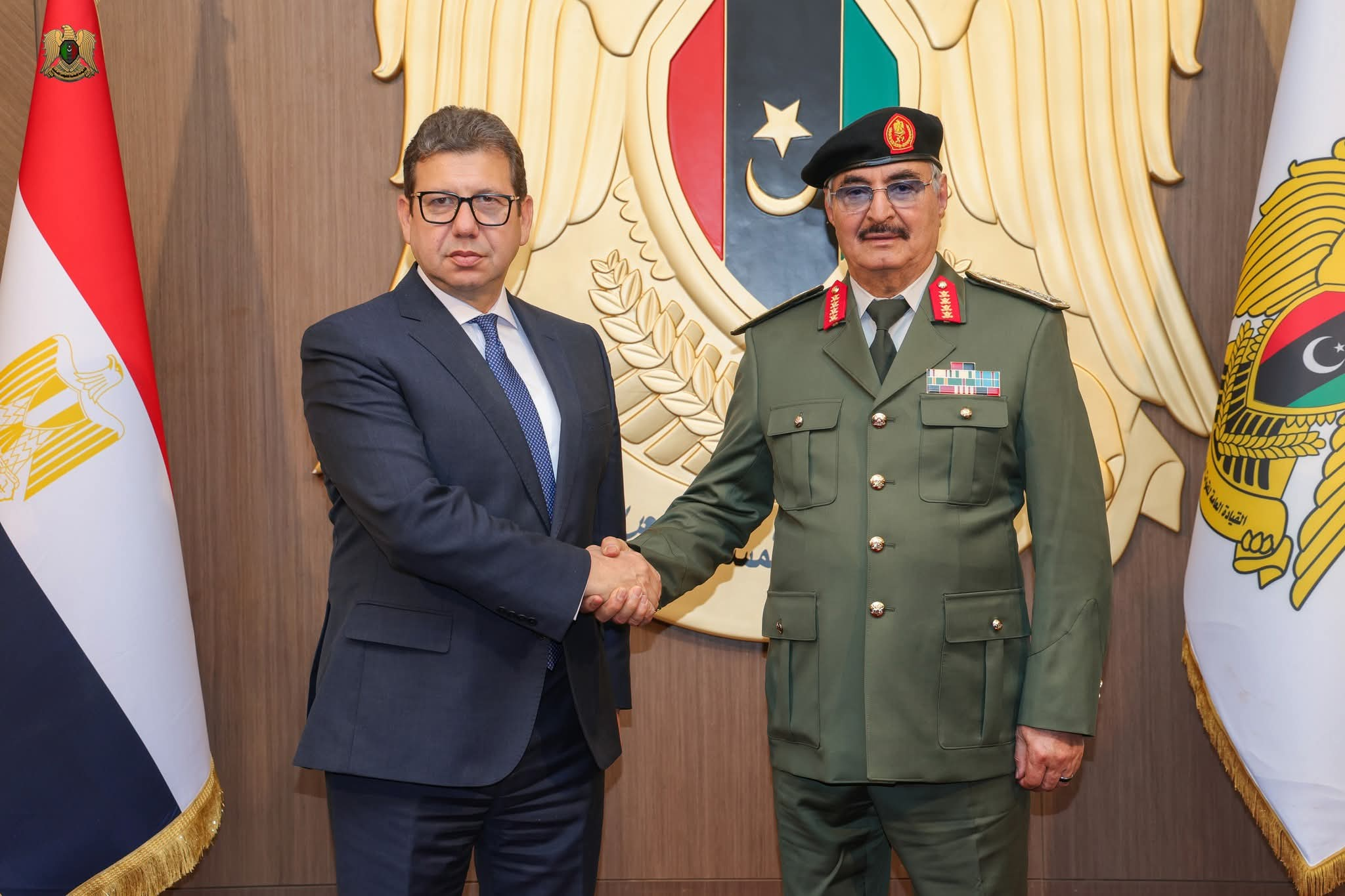 القائد العام للقوات المسلحة، المشير أركان حرب "خليفة أبوالقاسم حفتر"، يستقبل في مكتبه بمقرّ القيادة العامة بمدينة بنغازي، رئيس المخابرات العامة المصرية، اللواء "حسن رشاد"، والوفد المرافق له، بحضور رئيس الأركان العامة للقوات المسلحة، الفريق أول ركن "خالد حفتر" وكان في استقبال رئيس المخابرات العامة المصرية والوفد المرافق له، فور وصولهم إلى مدينة بنغازي، نائب القائد العام للقوات المسلحة، الفريق أول ركن "صدام حفتر" خلال اللقاء، نقل اللواء حسن رشاد تحيات فخامة رئيس جمهورية مصر العربية، عبدالفتاح السيسي، إلى القائد العام، مشيدًا بمستوى تطور العلاقات بين الجانبين، ومؤكدًا أهمية تعزيز الروابط الثنائية بين البلدين الشقيقين وناقش الجانبان التطورات المحلية والإقليمية، حيث تم التأكيد على أهمية استمرار التواصل والتنسيق بما يخدم المصالح المشتركة بين البلدين