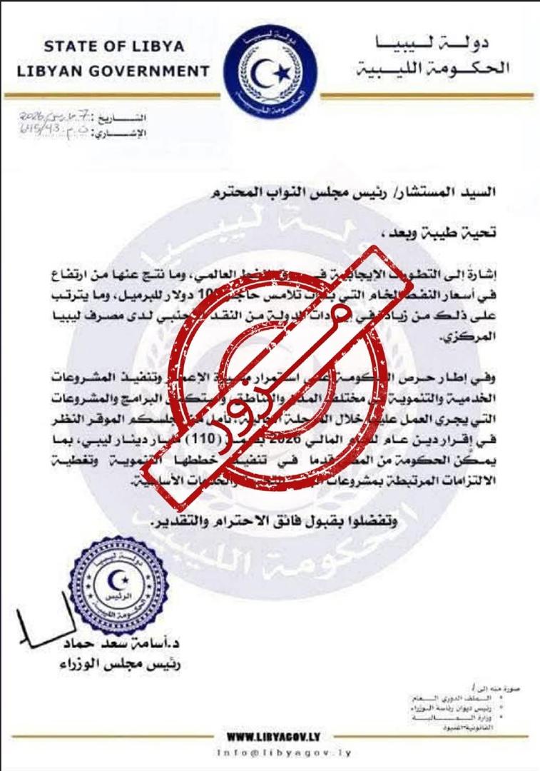 نفت الحكومة الليبية صحة مستند متداول على مواقع التواصل الاجتماعي منسوب إلى رئيس مجلس الوزراء أسامة حماد، مؤكدة أنه مستند مزوّر وعارٍ تمامًا عن الصحة وأوضحت الحكومة أن المستند المزعوم يتضمن خطابًا موجّهًا إلى مجلس النواب الليبي، يتحدث عن التطورات الإيجابية في سوق النفط العالمية وما نتج عنها من ارتفاع في أسعار النفط الخام إلى ما يتجاوز 100 دولار للبرميل، وما قد يترتب على ذلك من زيادة في الإيرادات والنقد الأجنبي لدى مصرف ليبيا المركزي كما يشير المستند المزور إلى إقرار دين عام للعام المالي 2026 بقيمة 110 مليارات دينار ليبي، بدعوى تمكين الحكومة من تنفيذ برامج ومشروعات خدمية وتنموية في مختلف المدن والمناطق وشددت الحكومة الليبية على أن هذا المستند مزوّر ولا أساس له من الصحة، داعية المواطنين ووسائل الإعلام إلى تحري الدقة واستقاء الأخبار من مصادرها الرسمية المعتمدة، وعدم الانسياق وراء الشائعات أو المعلومات المضللة المتداولة عبر وسائل التواصل الاجتماعي