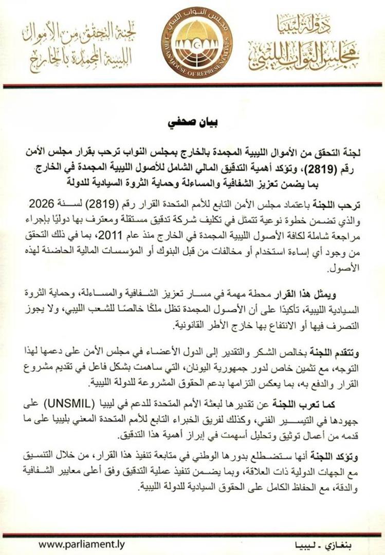 بيان لجنة التحقق من الأموال الليبية المجمدة بالخارج