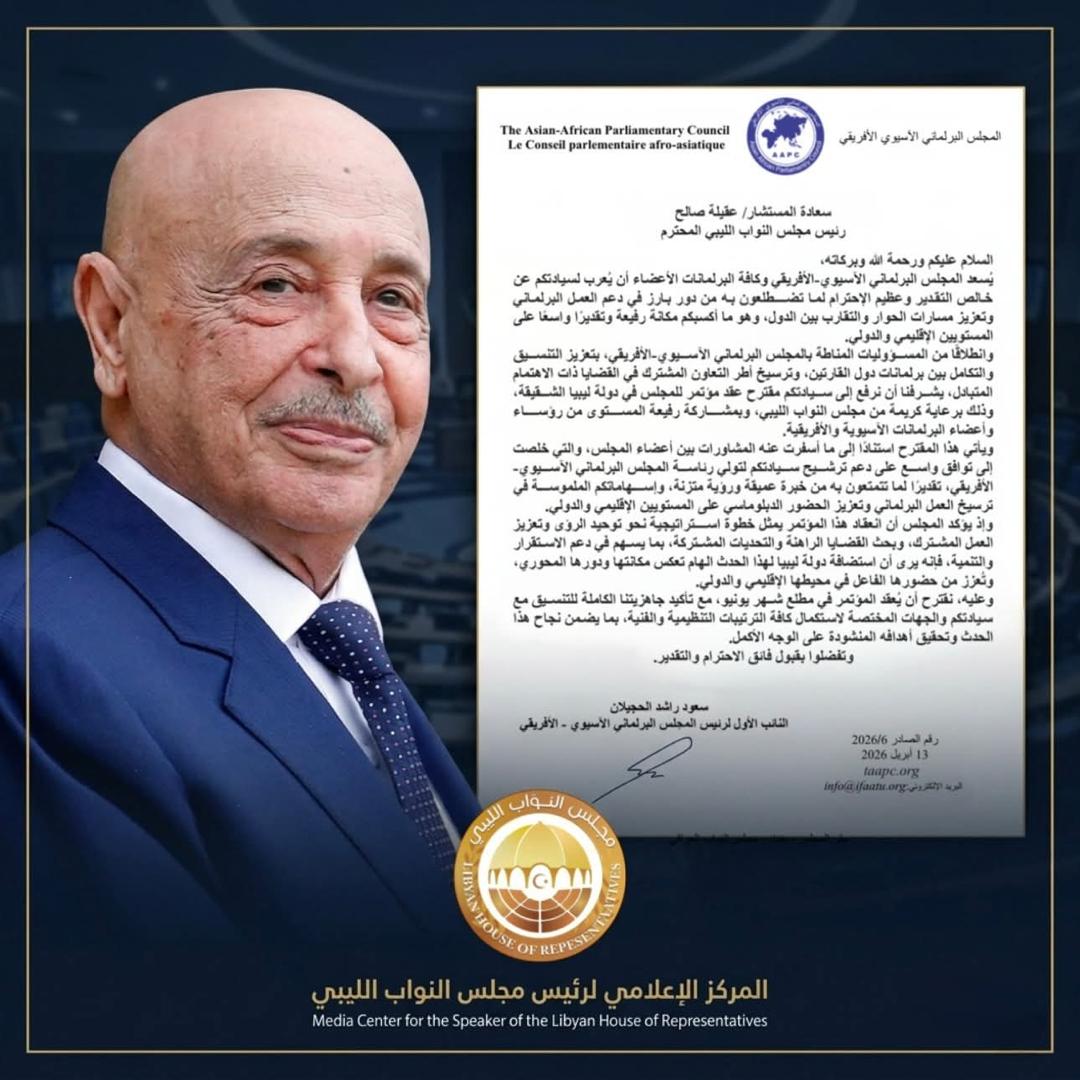في تقديرٍ لدوره البارز في دعم العمل البرلماني وتعزيز مسارات الحوار والتقارب بين الدول، أشاد المجلس البرلماني الآسيوي الأفريقي بجهود رئيس مجلس النواب معلنا ترشيحه لترأس هذا البرلمان الدولي وأكد المجلس أن هذا الترشيح جاء لما يتمتع به من حضور فاعل وإسهام ملموس في ترسيخ التعاون البرلماني على المستويين الإقليمي والدولي، وبما يعكس مكانة ليبيا ودورها المتنامي في هذا الإطار وأعرب المجلس، في مراسلة رسمية، عن تطلعه إلى تعزيز الشراكة مع مجلس النواب الليبي، مقترحًا عقد مؤتمر برلماني آسيوي-أفريقي في ليبيا، برعاية مجلس النواب الليبي وبمشاركة رفيعة المستوى من رؤساء وأعضاء البرلمانات في القارتين وأشار إلى أن هذا المقترح يأتي استنادًا إلى مشاورات واسعة بين أعضاء المجلس، والتي أفضت إلى توافق على دعم ترشيح المستشارلتولي رئاسة المجلس البرلماني الآسيوي الأفريقي، تقديرًا لما يمتلكه من خبرة ورؤية تسهم في تطوير العمل البرلماني وتعزيز الحضور الدبلوماسي وأكد المجلس أن انعقاد المؤتمر يمثل خطوة استراتيجية نحو توحيد الرؤى وتعزيز العمل المشترك لمواجهة التحديات الراهنة، بما يسهم في دعم الاستقرار والتنمية، لافتًا إلى أن استضافة ليبيا لهذا الحدث تعكس مكانتها ودورها المحوري في محيطها الإقليمي والدولي