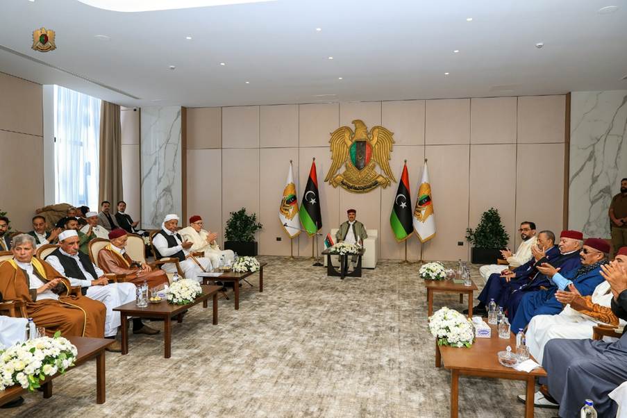 استقبل القائد العام للقوات المسلحة، المشير أركان حرب "خليفة أبوالقاسم حفتر"، مشايخ وأعيان وحكماء القبائل بالمنطقة الشرقية والوسطى والجنوبية الشرقية، في مدينة المشير خليفة حفتر العسكرية، وذلك بحضور رئيس الحكومة الليبية، الدكتور "أسامة حماد"، ورئيس الأركان العامة، الفريق أول ركن "خالد حفتر". خلال اللقاء، أكد مشايخ وأعيان وحكماء القبائل دعمهم المتواصل للقوات المسلحة، مثمّنين تواصل القائد العام وحرصه الدائم على تعزيز الروابط مع القبائل الليبية، ومشيدين بدور القوات المسلحة في حفظ الأمن والاستقرار في كافة ربوع الوطن. من جانبه، أثنى القائد العام على دور القبائل البارز في رعاية المصالحة الوطنية، موكّدًا دعمه لكافة الجهود التي تصب في مصلحة الوطن ووحدته