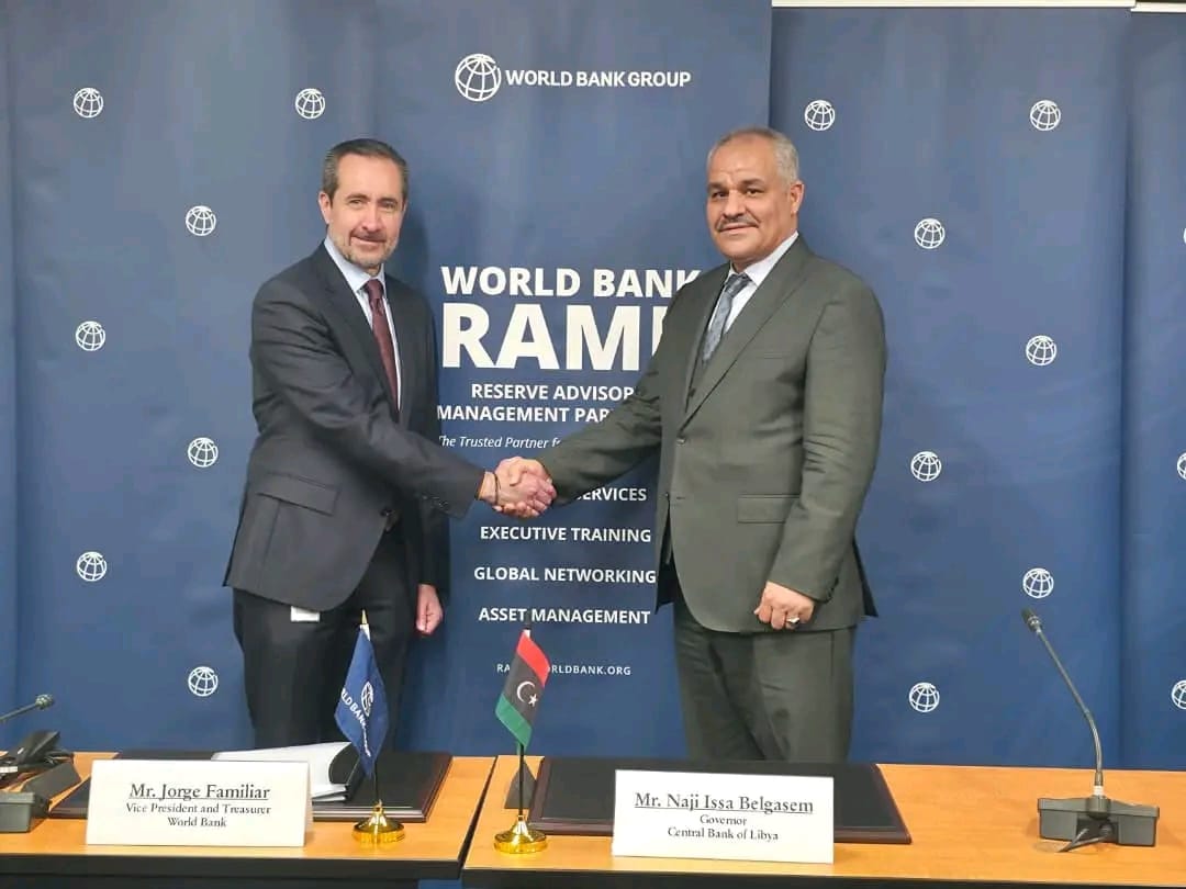 وقّع محافظ مصرف ليبيا المركزي ناجي عيسى، اتفاقية تعاون مع نائب رئيس البنك الدولي وأمين الخزانة خورخيه فاميليار، بمقر البنك في العاصمة الأمريكية واشنطن، وذلك في إطار برنامج الشراكة لإدارة الاحتياطيات والاستشارات (RAMP)