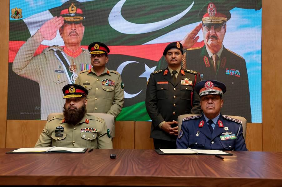 جانب من مراسم توقيع اتفاقية تعاون مشترك بين القوات المسلحة الليبية والجيش الباكستاني، عقب اجتماع نائب القائد العام للقوات المسلحة، الفريق أول ركن "صدام حفتر"، مع قائد الجيش الباكستاني، المشير "عاصم منير".
