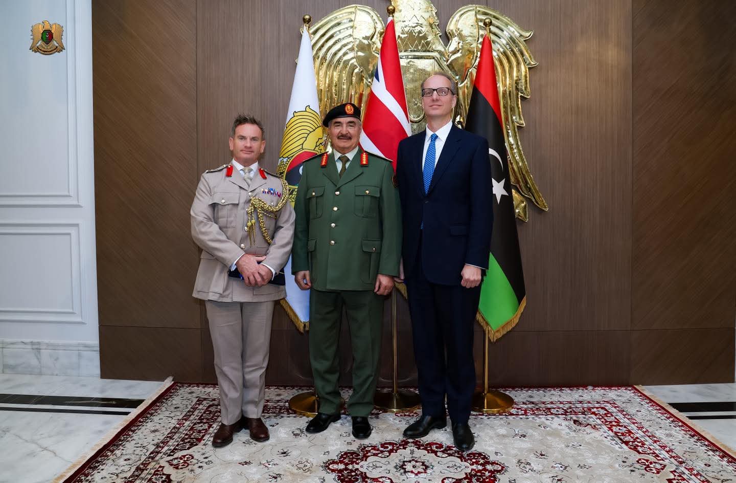 استقبل القائد العام للقوات المسلحة، المشير أركان حرب خليفة أبوالقاسم حفتر، يوم الثلاثاء، في مكتبه بمقرّ القيادة العامة، سفير المملكة المتحدة لدى ليبيا مارتن رينولدز، والوفد المرافق له ورحب القائد العام بالوفد الزائر، معربًا عن تمنياته للسفير البريطاني بالتوفيق في أداء مهامه، ومؤكدًا على أهمية تعزيز التنسيق والتعاون المشترك بين البلدين في المجالات الاقتصادية والأمنية، وتطوير برامج التدريب لرفع كفاءة وقدرات القوات المسلحة في مكافحة الإرهاب وتأمين الحدود من جانبه، عبّر السفير البريطاني عن سعادته بزيارة مقر القيادة العامة ولقاء القائد العام، مشيدًا بالجهود المبذولة لتعزيز الأمن والاستقرار، وبالنهضة العمرانية التي تشهدها المدن الليبية والتي تعكس حالة الاستقرار