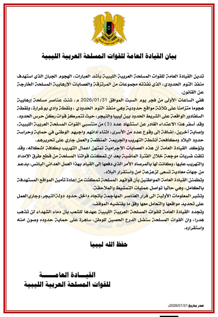 أدانت القيادة العامة للقوات المسلحة العربية الليبية، بأشد العبارات، الهجوم الجبان الذي استهدف منفذ التوم الحدودي، ونفذته مجموعات من المرتزقة والعصابات الإرهابية المسلحة الخارجة عن القانون، مؤكدة أن هذا الاعتداء الإجرامي يستهدف أمن البلاد واستقرارها، ولن يثني القوات المسلحة عن مواصلة واجبها الوطني في حماية الحدود وأوضحت القيادة العامة، في بيان لها، أن عناصر إرهابية مسلحة شنت في الساعات الأولى من فجر السبت هجوما متزامنا على ثلاثة مواقع حدودية، تمثلت في منفذ التوم الحدودي، ونقطة وادي بوغرارة، ونقطة السلفادور الواقعة على الشريط الحدودي بين ليبيا والنيجر، حيث تتمركز قوات ركن حرس الحدود المكلفة بتأمين المنطقة ومكافحة أنشطة التهريب والجريمة المنظمة