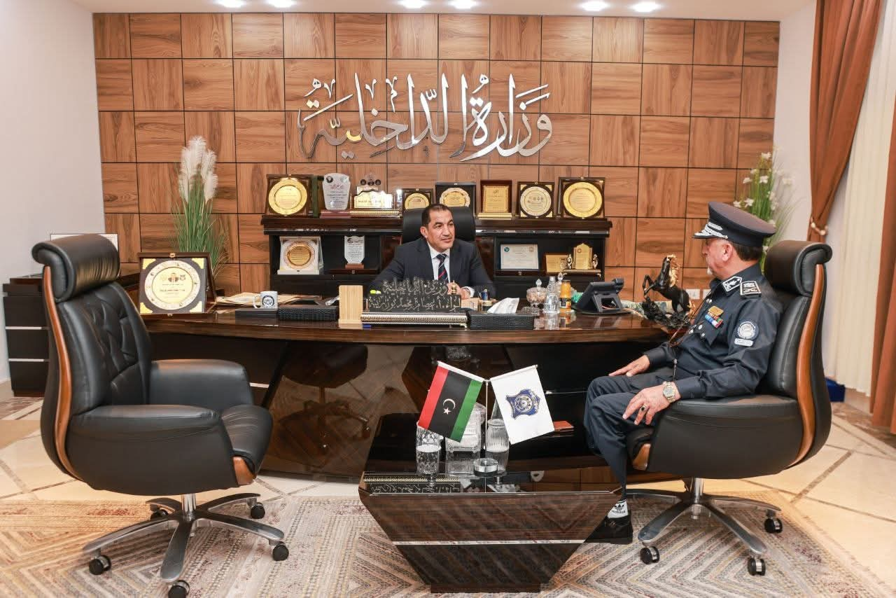 عقد وزير الداخلية اللواء "عصام أبوزريبة"، اجتماعًا مع مدير الإدارة العامة لحماية البعثات الدبلوماسية اللواء زيـاد الحاسـي لمتابعة سير العمل بالإدارة واستعراض مستجدات برامج التأهيل والتطوير وتناول الاجتماع أبرز إنجازات الإدارة مع مطلع العام الجاري، وفي مقدمتها تخريج الدفعة الأولى للأمن الدبلوماسي التابعة للإدارة، والبالغ عددها 120 عضوًا، وذلك عقب استكمال برامجهم التدريبية يوم الأحد الماضي، إضافة إلى مناقشة اعتماد الهيكل التنظيمي المقترح بما يسهم في تنظيم العمل ورفع كفاءته
