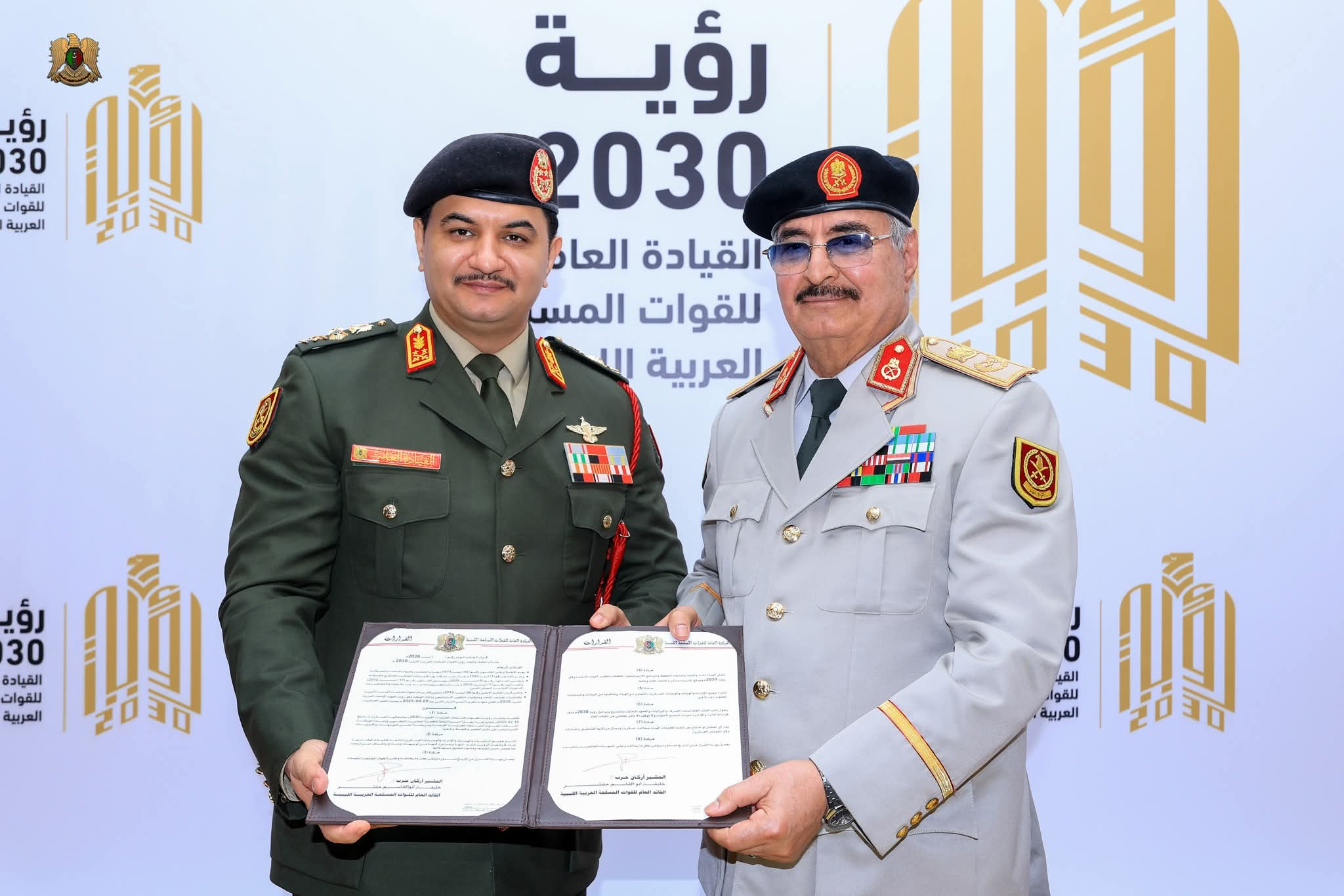 أعلن القائد العام للقوات المسلحة المشير أركان حرب خليفة حفتر، إطلاق «رؤية 2030 لتطوير القوات المسلحة العربية الليبية»، وذلك خلال مراسم رسمية حضرها نائب القائد العام الفريق أول ركن صدام حفتر، والأمين العام للقيادة العامة، ورؤساء الأركان، وعدد من قيادات القوات المسلحة وتمثل «رؤية 2030» مسارا استراتيجيا شاملا يقود مرحلة التحول العسكري، ويؤسس لمرحلة جديدة من الاحترافية والجاهزية، عبر وضع أسس بناء مؤسسة عسكرية حديثة وقوية، قادرة على حماية الوطن وصون سيادته والحفاظ على أمنه واستقراره وتستند الرؤية إلى منهج التخطيط الاستراتيجي والعمل المؤسسي القائم على أهداف واضحة ومحددة، بما يعزز كفاءة الأداء ويرسخ مبادئ الانضباط والاحتراف