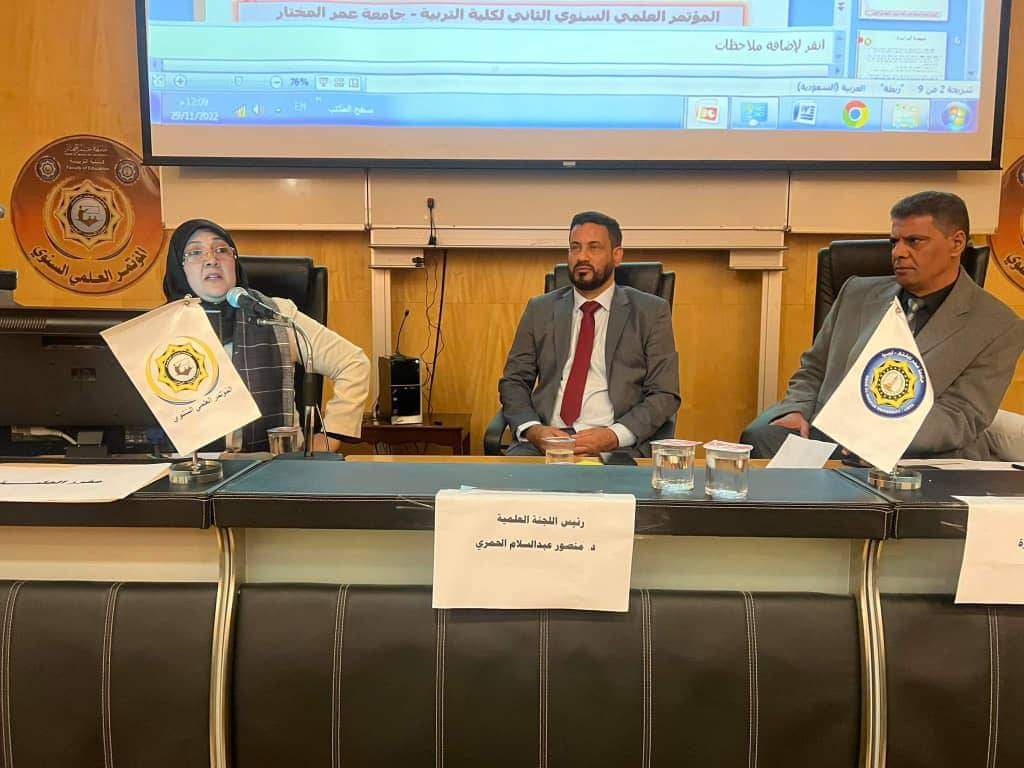 وجاءت مشاركة كلية التربية من خلال ورقتين بحثيتين، الورقة البحثية الأولى قدمتها الدكتورة نجاة الشريف كانت عن درجة امتلاك طلاب كلية التربية بنغازي للكفايات التدريسية من وجهة نظر المعلمين بالمدارس المتعاونة