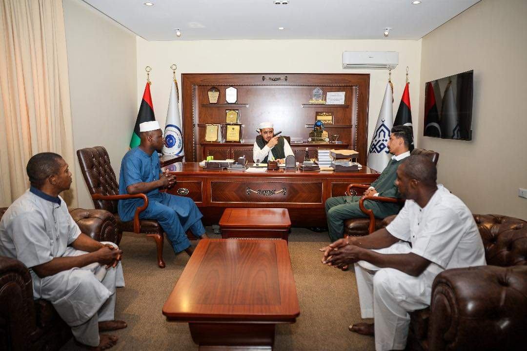 استقبل رئيس الهيئة العامة للأوقاف والشؤون الإسلامية بالحكومة الليبية عاطف العَبيدي ثلاثة إخوة من دولة نيجيريا، والذين أعلنوا اعتناقهم الدين الحنيف في اليوم الختامي لجائزة ليبيا الدولية لحفظ وتجويد القرآن الكريم، في نسختها الثانية عشر، حاملين في قلوبهم شغفًا عظيمًا لمعرفة المزيد عن الإسلام وسماحة تعاليمه، ومعبرين عن سعادتهم بإشهار إسلامهم