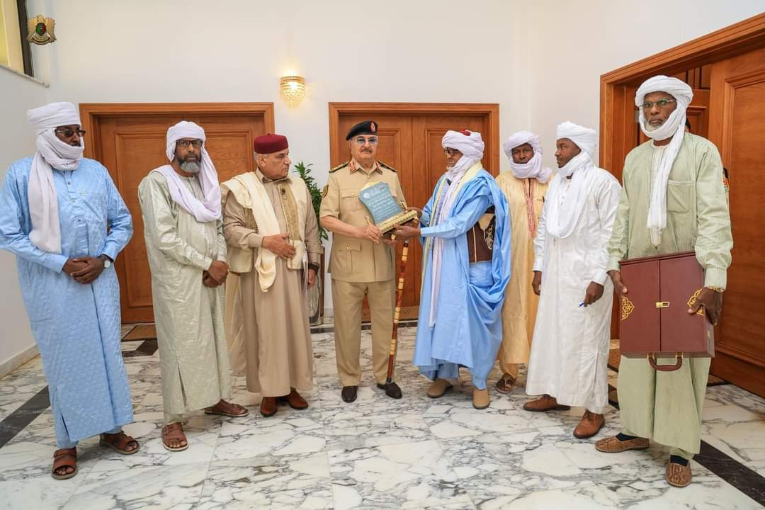 اجتمع القائد العام للجيش الليبي المشير خليفة حفتر، بوفد من أعيان ومشائخ وشباب قبائل التبو، في مكتبه بمقرّ للقيادة العامة، المشير حفتر عن تقديره لقبائل التبو ومكانتهم الاجتماعية، ودور أبناء التبو في دعمهم وإلتحامهم بالقوات المسلحة في حربها على الإرهاب والتطرف وشارك مشايخ قبائل. التبو بالشكر لهم لدور أفضل للقوات المسلحة في بسط الأمن، وتضمنت جميع المدن التابعة للمنطقة الجنوبية من أجل تقديم الخدمات