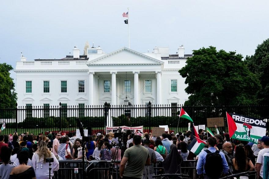 ملأ محتجون مناصرون لفلسطين جدار ونصب مؤسسي في محيط البيت الأبيض بالرسومات الداعمة لحرية فلسطين وضد الحرب الإسرائيلية على غزة، أظهروا عمل واشنطن على الوقف الفوري للمجازر في وقت سابق من مساء أمس جمع المساهمين في وسط العاصمة المظاهرة المؤيدة للفلسطينيين وطوقوا البيت الأبيض، مثلون بوقف توريد الأسلحة من الولايات المتحدة إلى قطاع كيانو وإيقاف إطلاق النار في غزة
