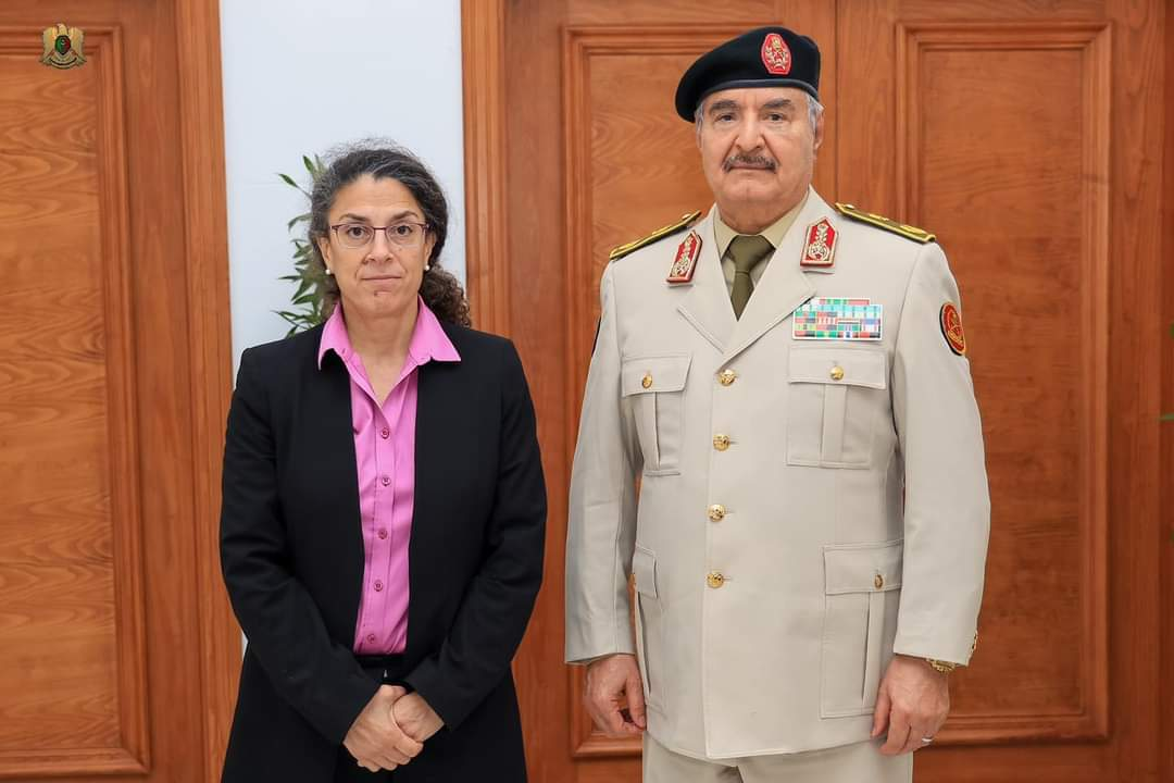 القائد العام للقوات المُسلحة العربية الليبية المُشير أركان حرب خليفة أبوالقاسم حفتر، يستقبل في مكتبه بمقرّ القيادة العامة بنغازي القائمة بأعمال رئيس بعثة الأمم المتحدة في ليبيا ستيفاني خوري، والوفد المُرافق لها