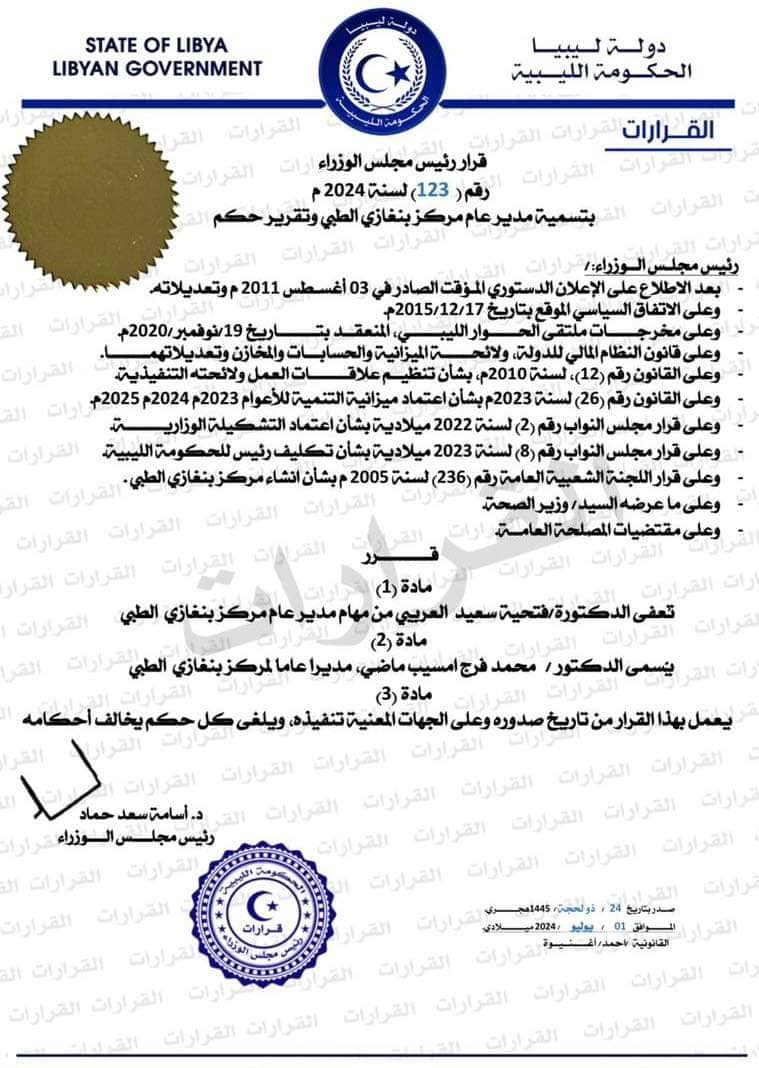 أصدر رئيس مجلس الوزراء بالحكومة الليبية، الدكتور أسامة حماد، قرارًا رقم (123) لسنة 2024، والذي يتضمن تعيين مدير عام جديد لمركز بنغازي الطبي وتقرير حكم وبموجب هذا القرار، تم إعفاء الدكتورة فتحية سعيد العريبي من مهامها كمدير عام للمركز، وتعيين الدكتور محمد فرج إمسيب ماضي بدلاً منها