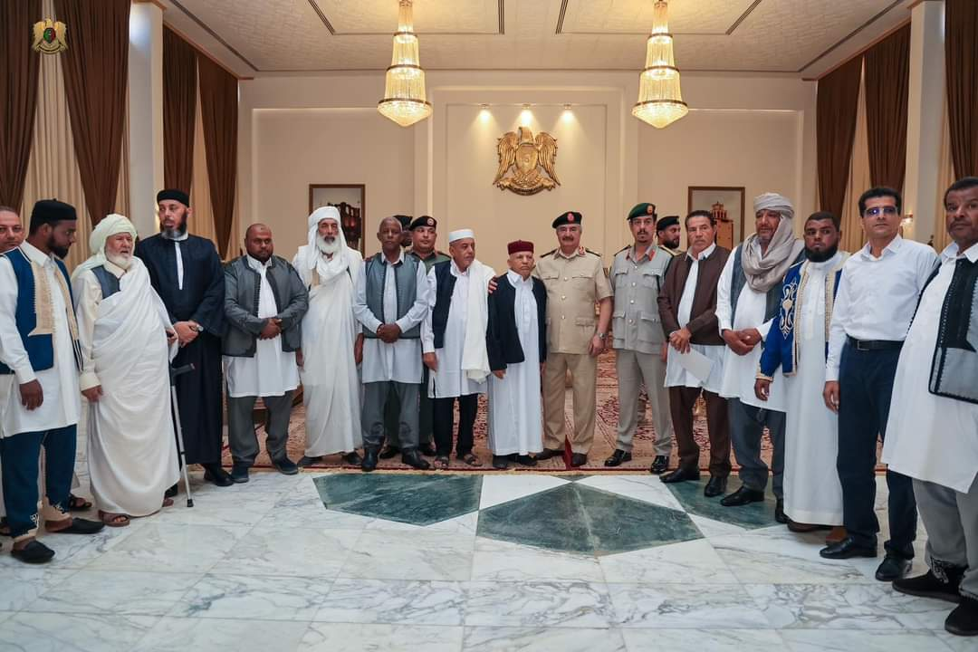 القائد العام للقوات المُسلحة المُشير خليفة حفتر، يستقبل في مكتبه بمقرّ القيادة العامة بنغازي، وفداً من مشايخ وأعيان ومثقفي قبيلة الحساونة