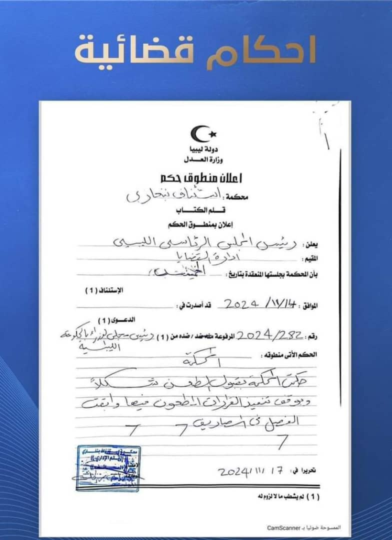 قضت محكمة استئناف بنغازي، الدائرة الإدارية الثانية، في الدعوى المسجلة تحت رقم 282/2024 م بقبول الطعن شكلًا ، وفي الموضوع، بوقف نفاذ القرار ات المطعون فيها والصادرة عن المجلس الرئاسي، والذي أنشأ بموجبها جسمًا موازيًا للمفوضية العليا للانتخابات ، أطلق عليه مسمّى المفوضية الوطنية للاستفتاء والاستعلام الوطني، وعيّن لها مجلسًا لإدارتها