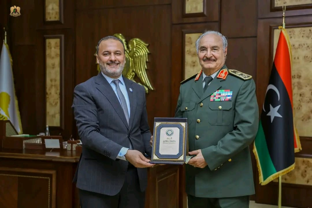 التقى القائد العام للقوات المسلحة المشير خليفة حفتر، مع رئيس جامعة بنغازي عزالدين الدرسي، في مكتبه بمقر القيادة العامة