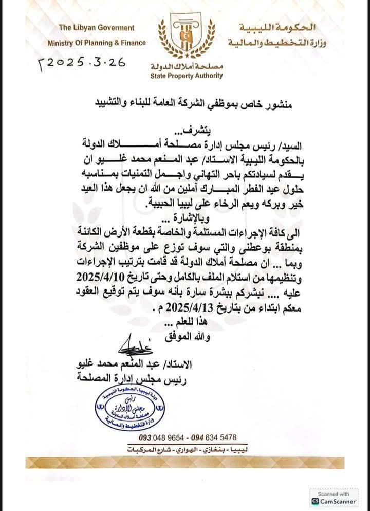 ويأتي هذا الإعلان في إطار جهود مصلحة أملاك الدولة لدعم موظفي الشركة وتوفير سكن مناسب لهم، بما يساهم في تحسين ظروفهم المعيشية. وتوجهت المصلحة بأطيب التمنيات لجميع المواطنين، متمنية أن يكون هذا العيد مناسبة مليئة بالخير والبركة على ليبيا وأهلها