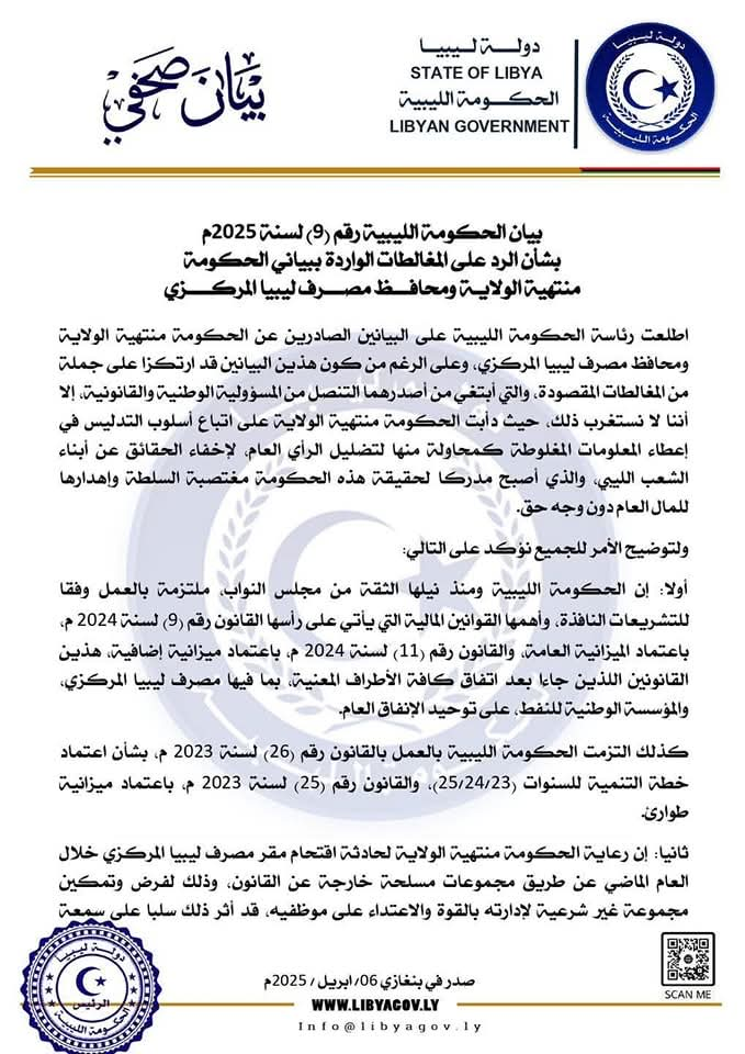 أكدت الحكومة الليبية، أنها اطلعت على البيانات الصادرة عن الحكومة منتهية الولاية ومحافظ مصرف ليبيا المركزي، واعتبرت أن هذه البيانات تضمنّت مغالطات تهدف إلى التنصل من المسؤولية الوطنية والقانونية وأوضحت الحكومة الليبية، في بيان رسمي، أن حكومة الوحدة الوطنية السابقة، اعتمدت أسلوب التدليس لتضليل الرأي العام وإخفاء الحقائق عن الشعب الليبي وأشارت في بيانها رقم (9) لسنة 2025 م، إلى أنها مُلتزمة بالعمل وفق التشريعات النافذة، بما في ذلك القوانين المالية الخاصة بالميزانية العامة لعام 2024 م، والقوانين المتعلقة بخطة التنمية، وأكدت أن هذه القوانين كانت نِتاج توافق شامل مع جميع الأطراف المعنية، مثل مصرف ليبيا المركزي والمؤسسة الوطنية للنفط كما أوضح البيان أن الحكومة منتهية الولاية، قد تسببت في تدهور الوضع الاقتصادي، لاسيما من خلال تمكين الإنفاق دون سند قانوني، مما أدى إلى تدهور سعر صرف الدينار الليبي، مشيرًا إلى أن الحكومة السابقة قامت بالاعتداء على أموال الدولة من خلال إجراءات مخالفة للقانون، أبرزها صرف أموال لمشروعات وهمية ورفع الإنفاق الحكومي دون أساس قانوني وأكدت الحكومة الليبية أنها تواصل جهودها لتحقيق الاستقرار الاقتصادي