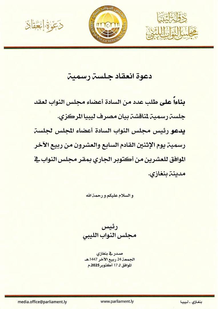 فخامة رئيس مجلس النواب المستشار عقيلة صالح يدعو السادة أعضاء المجلس لجلسة رسمية