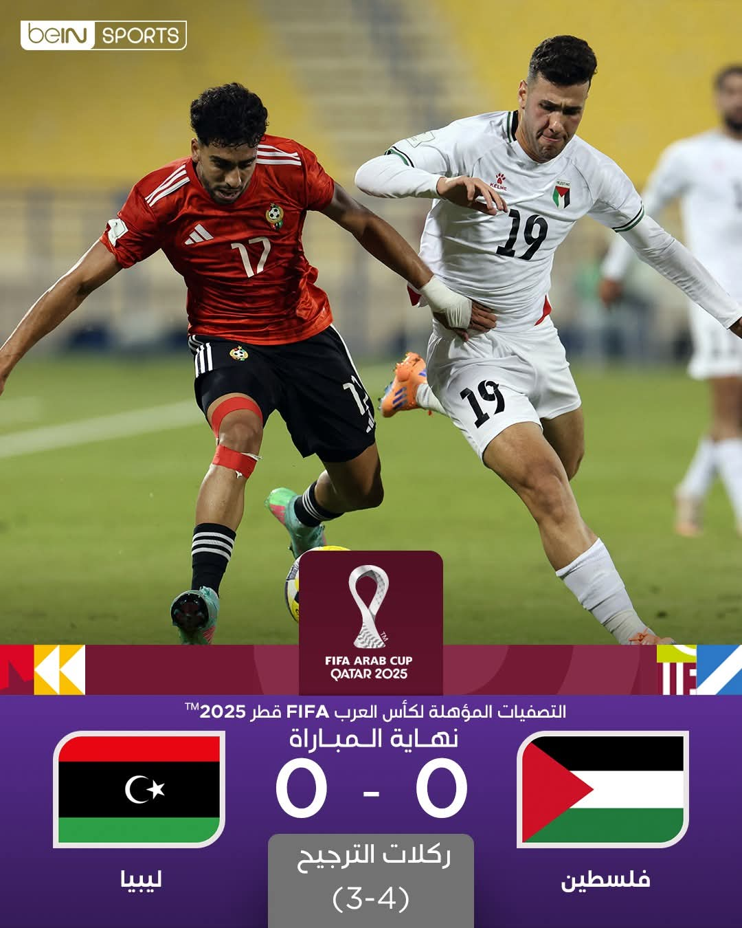 وجاء تأهّل منتخب فلسطين بعد فوزه على نظيره منتخب ليبيا بركلات الترجيح (4-3) بعد نهاية الوقت الأصلي للمواجهة بالتعادل السلبي اضمن منافسات التصفيات المؤهلة لكأس العرب FIFA قطر 2025