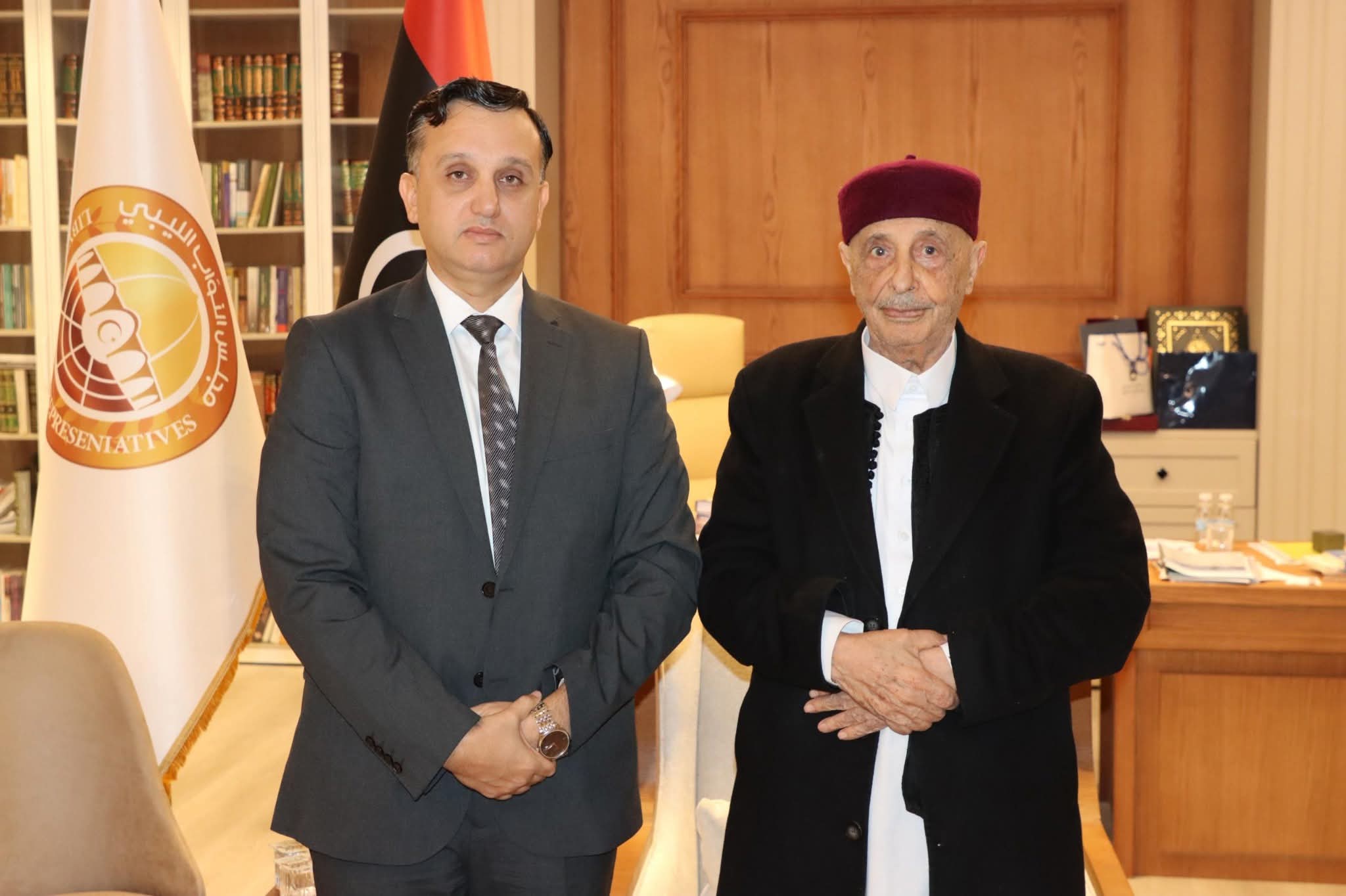 استقبل فخامة المستشار عقيلة صالح رئيس مجلس النواب بمكتبه بمدينة القبة الأستاذ خالد نجم رئيس هيئة الرقابة الإدارية والسادة مدراء الإدارات العامة والمكاتب بالهيئة