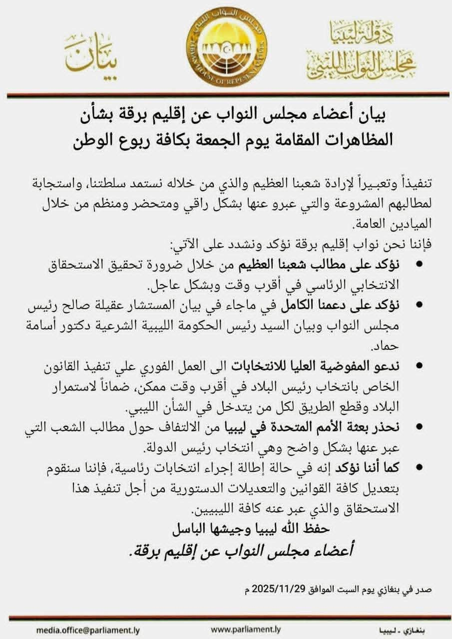 وجاء بيان نواب إقليم برقة، عقب المظاهرات التي شهدتها مختلف المدن الليبية يوم الجمعة، مُؤكدين أن هذه الاحتجاجات تعكس إرادة الشعب الليبي وتعبيره الراقي والمنظم عن مطالبه المشروعة