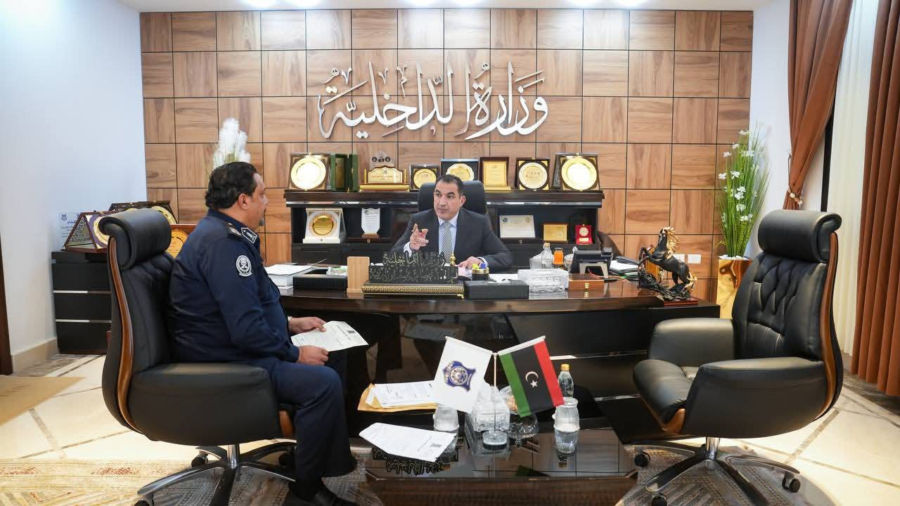 اجتمع وزير الداخلية، اللواء عصام أبوزريبة، مع اللواء "صلاح الخفيفي"، رئيس جهاز مكافحة الهجرة غير الشرعية، في مكتبه بديوان الوزارة بمدينة بنغازي